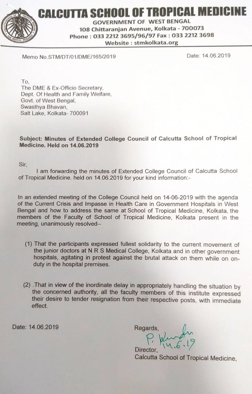Joining the protests that have now taken a national character, Doctors of Calcutta School of Tropical Medicine have also resigned.
