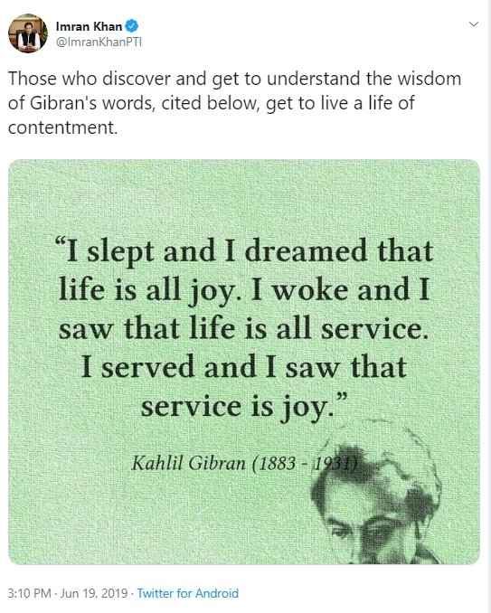 Imran Khan posted a tweet today, attaching an image that contained an inspirational quote. It says, “I slept and dreamt that life is all joy. I woke and saw that life is all service. I served and I saw that service is joy.” The quote was followed by the words Kahlil Gibran (1883-1931), implying that he wrote it.