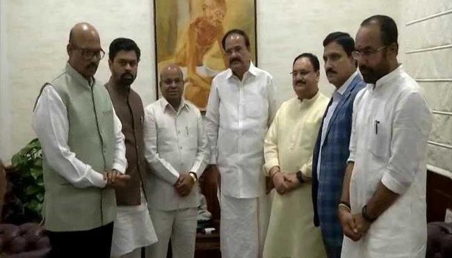 TDP Rajya Sabha MPs YS Chowdary, TG Venkatesh, and CM Ramesh resign from TDP, submit resignation letter to M Venkaiah Naidu, Vice-President and Rajya Sabha chairman, in Delhi. pic.twitter.com/7lLpxyBRgf