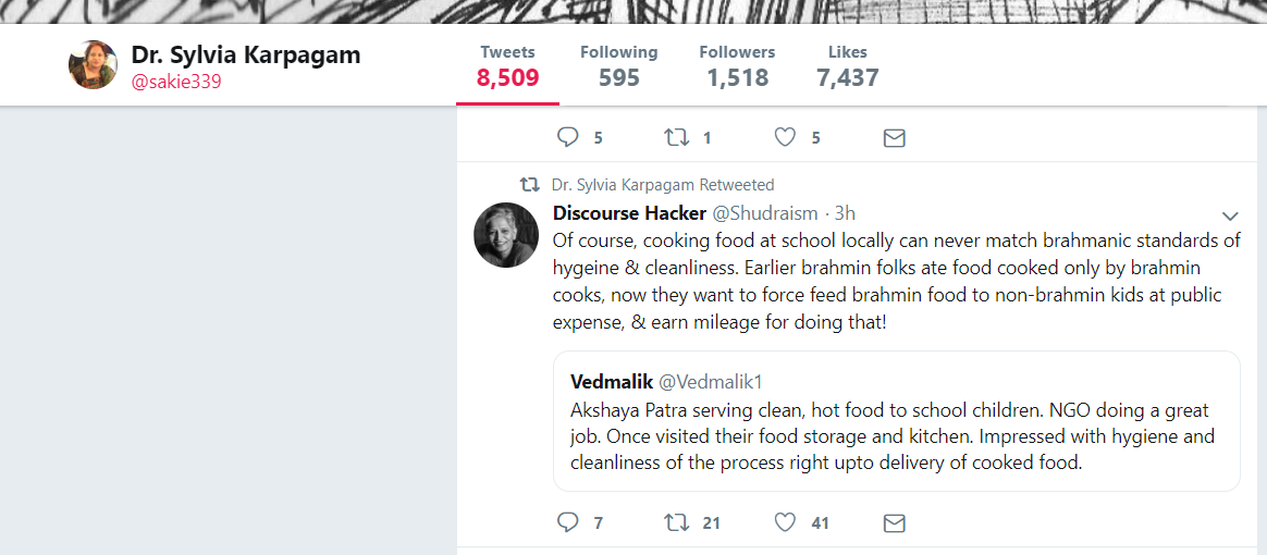 That the opinions of such bigots are treated so respectably in mainstream media is a grave cause for concern. It appears quite obvious that Karpagam’s tirade against Akshaya Patra is motivated by a virulent hatred for the Brahmin community and a desire to uproot ‘Brahmin hegemony’. In her mind, APF is a Brahminical organization despite the fact that it is an arm of ISKCON which is a Vaishnavite sect. Therefore, the mid-day meals must be opposed at all costs.