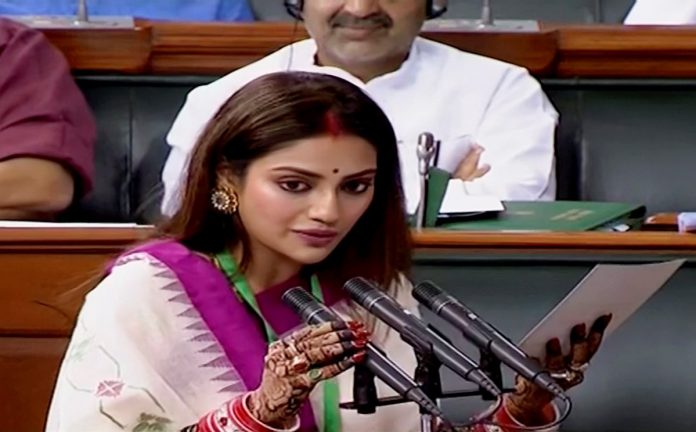 Newly-elected Trinamool Congress MP from Basirhat, Nusrat Jahan-Ruhi Jain, on June 25 took oath as members of the Lok Sabha. As soon as the House met for the day Nusrat Jahan, the actor turned politician took oath in Bangla.