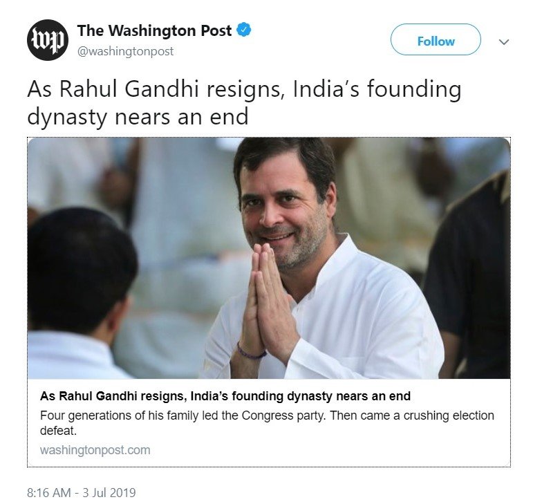 In a news report that highlights how little the Western world knows about Indian realities, Washington Post referred to the Nehru-Gandhi dynasty as India’s ‘Founding Dynasty’. The report, which highlights the vacuum in the leadership of India’s main opposition party, stated that with Rahul Gandhi’s resignation, the dynasty was nearing an end.