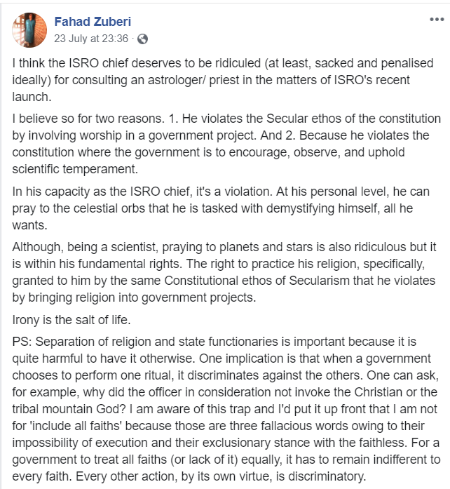 Zuberi provides two reasons for his claims. Firstly, “He violates the Secular ethos of the constitution by involving worship in a government project.” And secondly, “he violates the constitution where the government is to encourage, observe, and uphold scientific temperament.” He adds, “In his capacity as the ISRO chief, it’s a violation. At his personal level, he can pray to the celestial orbs that he is tasked with demystifying himself, all he wants.” In the postscript, Zuberi implies that by “consulting astrologers/priests”, the government is discriminating against other faiths.