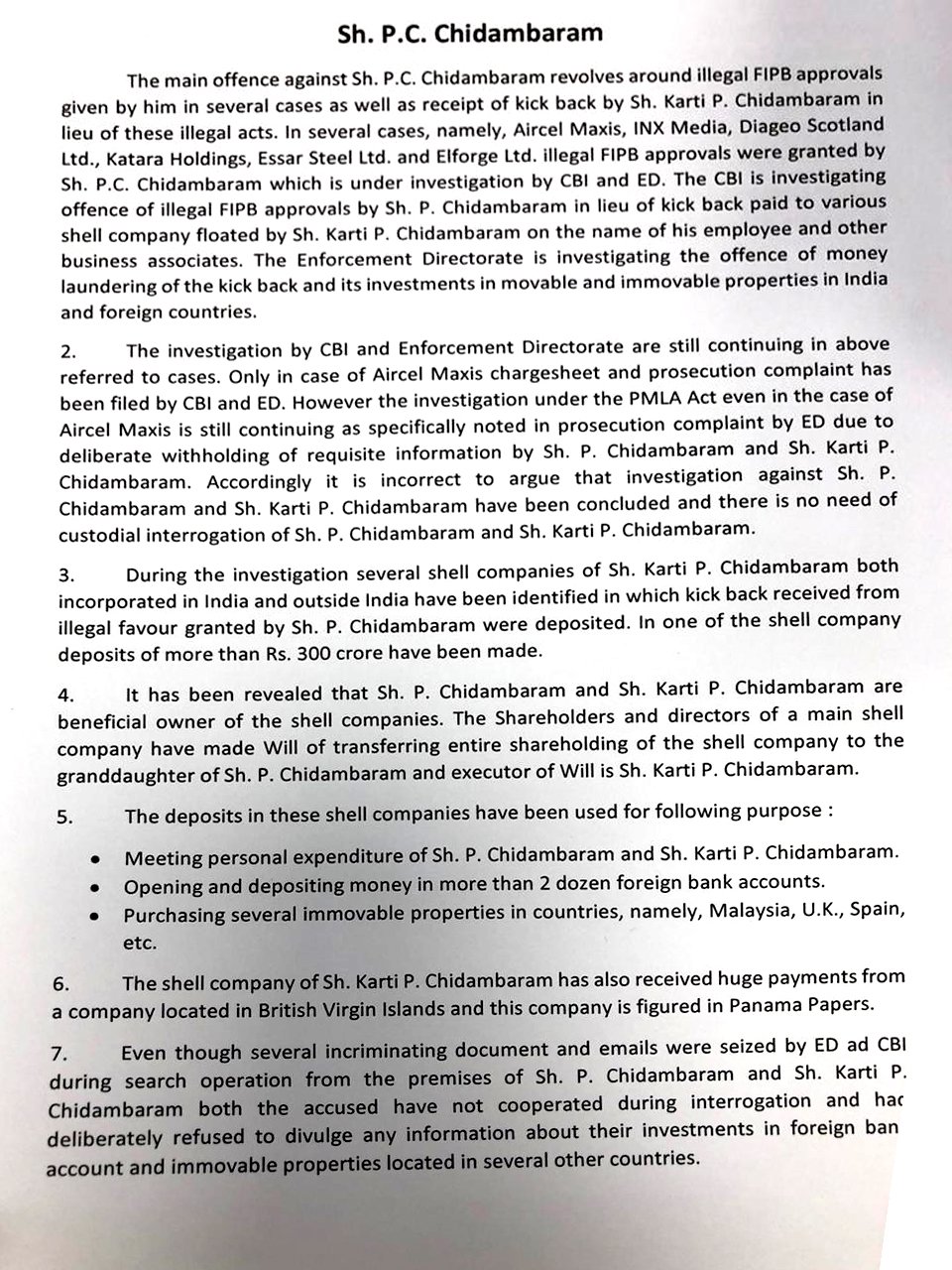 The statement alleges that even though several incriminating document and emails were seized by ED ad CBI during search operation from the premises of P. Chidambaram and Karti P. Chidambaram, both the accused have not cooperated during interrogation and have deliberately refused to divulge any information about their investments in foreign bank account and immovable properties located in several other countries.