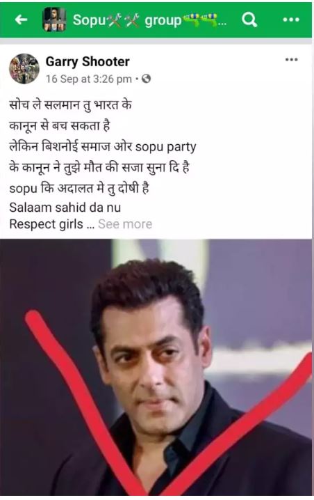 The post carried Salman’s picture with a red cross along with the message: “Salman you may think that you are above the Indian law, but the Bishnoi community and Suopu party has given you a death sentence. You are guilty in Sopu court.”