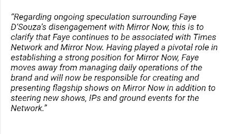 Now, however, Times Network has issued a statement clarifying that Faye will continue to be associated with Times Network and Mirror Now.