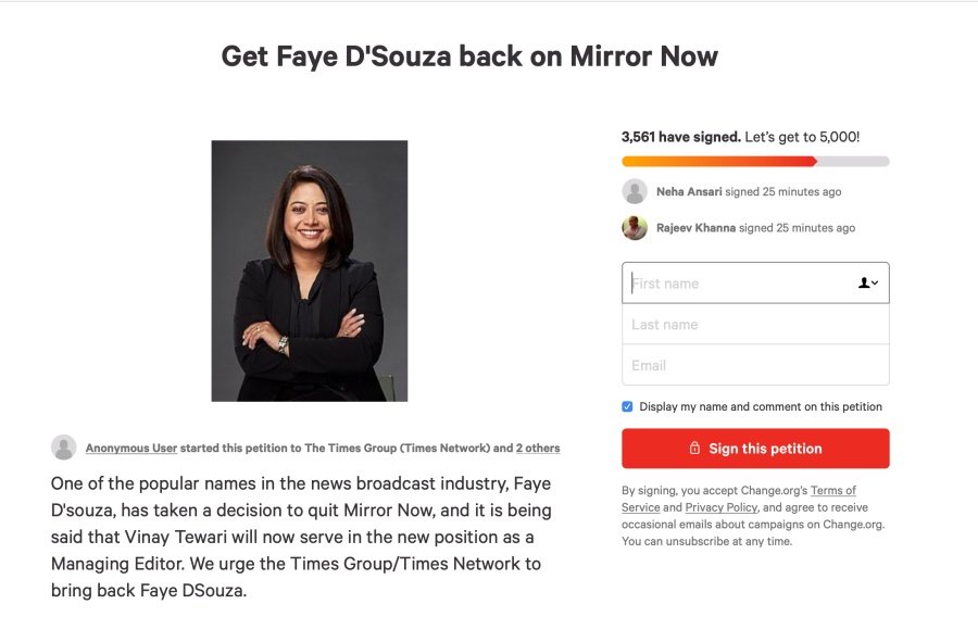 In fact, there was even a change.org petition that demanded that Faye D Souza be brought back to Mirror Now.