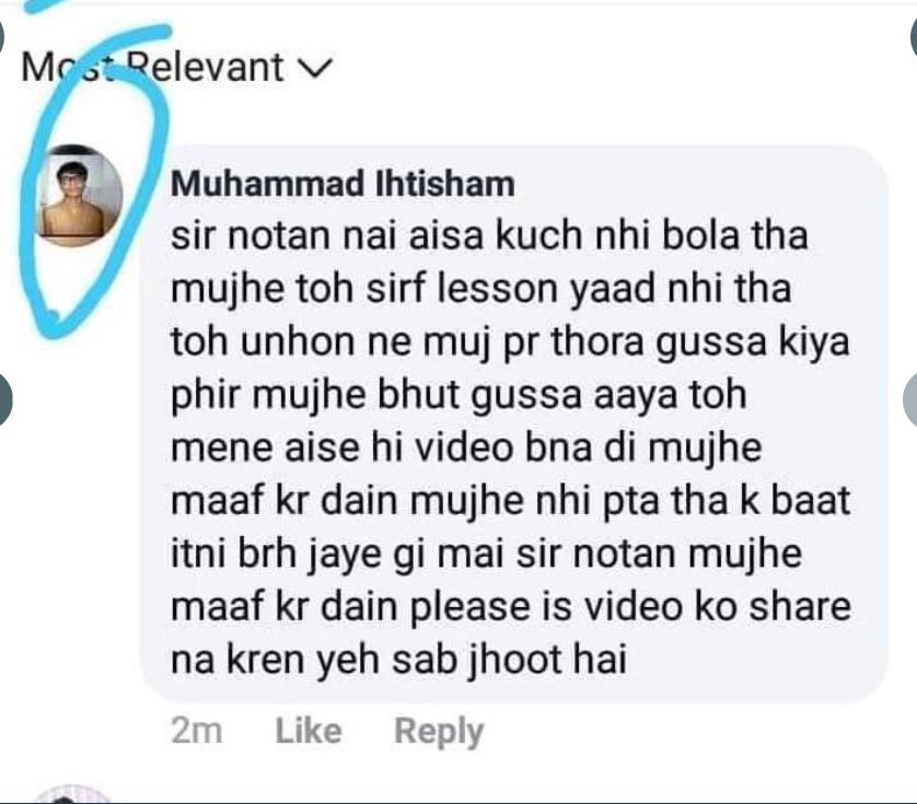 Muhammad Ihtisham, on whose complaint his father had filed a First Information Report (FIR) against the principal of Sindh Public School, has revealed in a social media post that he was very angry with the principal Notan Lal for scolding him. Since he had not memorised his lesson, the principal had scolded him. This prompted him to make false allegations of blasphemy against the principal. He added that he had no clue that the issue would blow up to such a proportion. He urged “Sir Notan” for forgiveness in the social media post.
