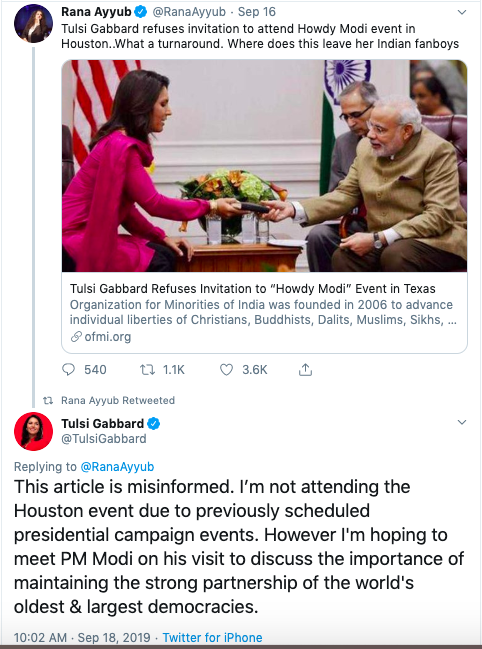 Is this true @TulsiGabbard ?? Tulsi Gabbard Refuses Invitation to “Howdy Modi” Event in TexasOrganization for Minorities of India https://t.co/DtXUulAHmm