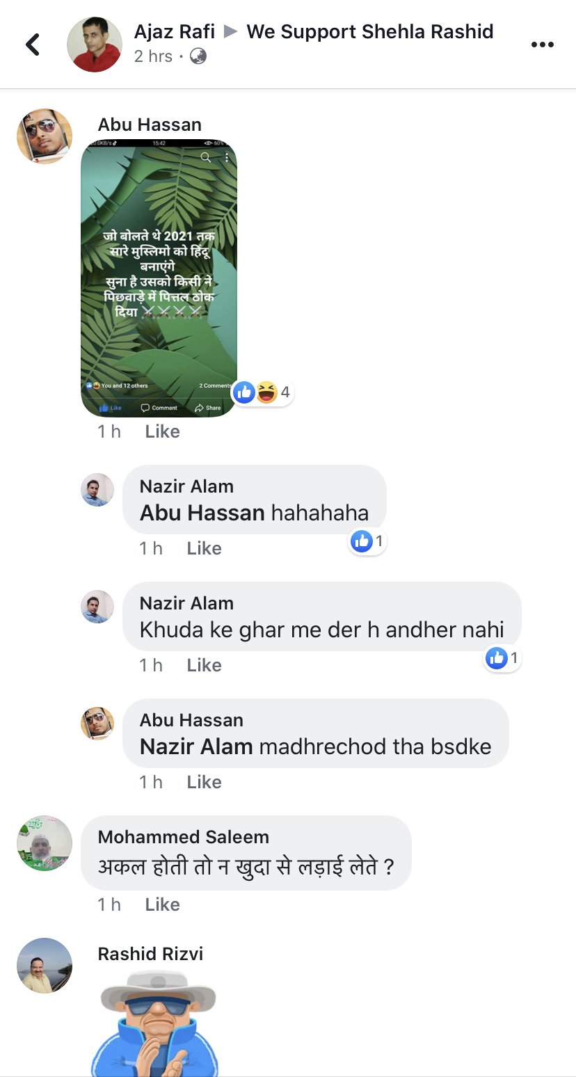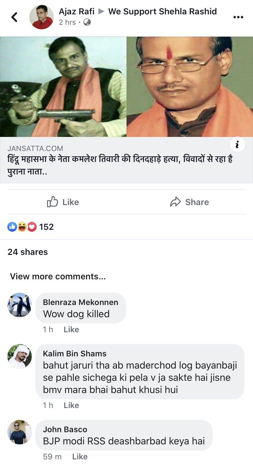 The followers of “We support Shehla Rashid” Facebook page also seemed to rejoice over the murder of the former Hindu Mahasabha leader. Many followers expressed delight and satisfaction over the murder while others abusing Kamlesh Tiwari with choicest of expletives commented that Tiwari ‘deserved’ this.