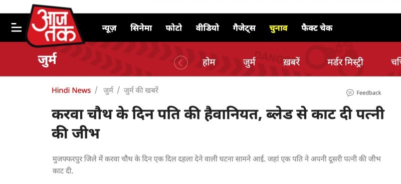 In a shocking incident from Bihar’s Muzaffarpur, a Muslim man severed his wife’s tongue yesterday. However, in a bid to sensationalise the episode, news channel Aajtak maligned the Hindu festival of ‘Karwa Chauth’ by giving an egregious twist in their headlines to convey that a brutality was committed by a husband on the day of ‘Karwachauth’, the day when Hindu women generally fast for their husband’s long and healthy life.
