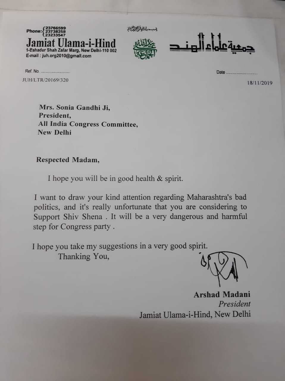 In a letter dated November 18, the Jamiat Ulema-e-Hind president, Arshad Madani has denounced the move by calling it “unfortunate.” It reads that an alliance with Shiv Sena is “very dangerous” and “harmful” for the grand old party.