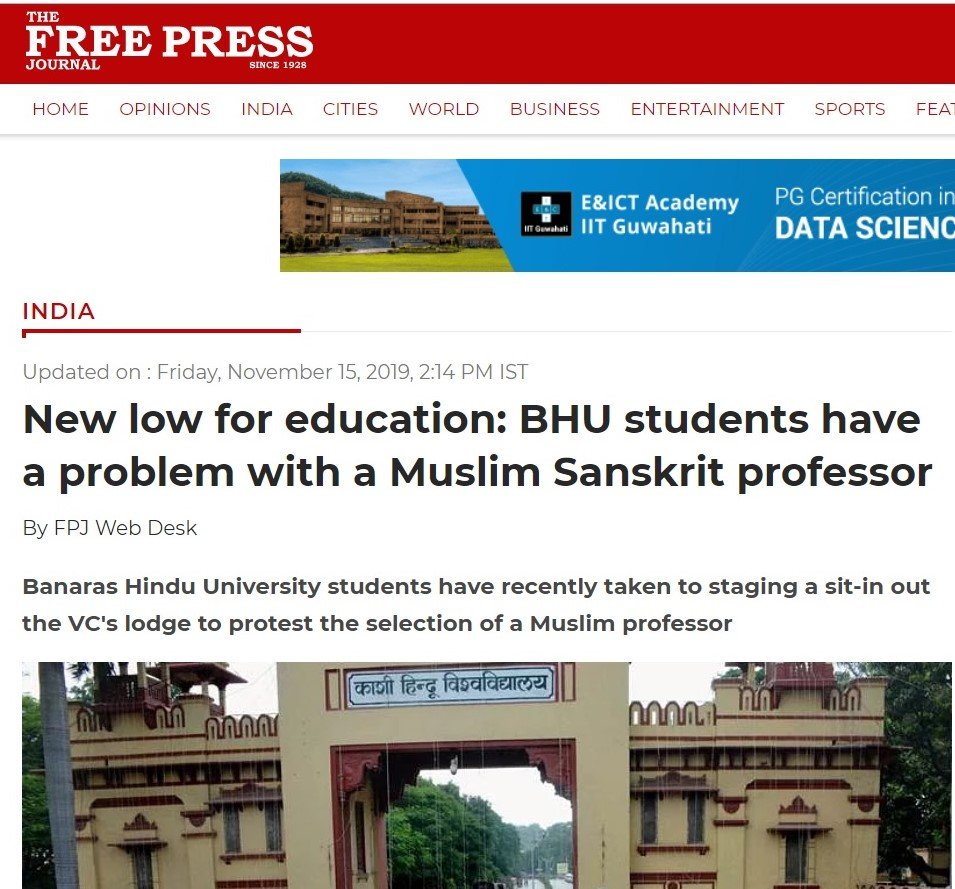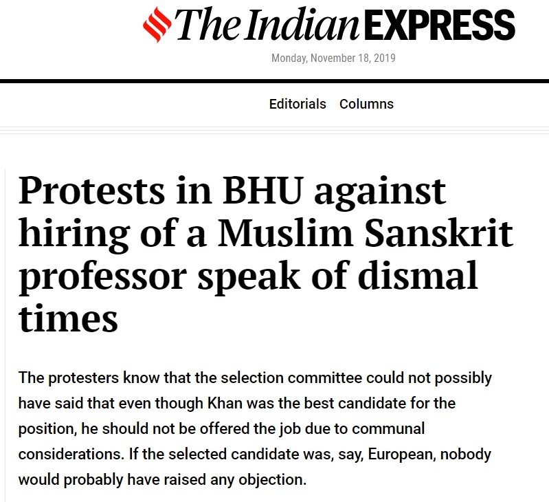 The Indian Express claimed that the protests speak of ‘dismal times’. It said, “It is a measure of the hatefulness and narrow-mindedness that has come to permeate the national atmosphere that the appointment of a young Muslim Sanskrit scholar, Firoz Khan, as an assistant professor in the literature department of the Sanskrit Vidya Dharma Vijnan at Banaras Hindu University has brought forth protests from his to-be colleagues as well as the faculty’s PhD students, demanding a cancellation of the appointment.”