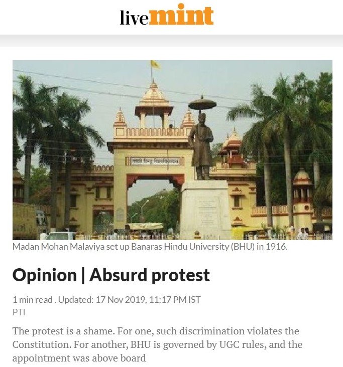LiveMint, meanwhile, was muted in comparison to others and only reproduced an article by PTI that called the protests ‘absurd’ and a ‘shame’. It said, “The protest is a shame. For one, such discrimination violates the Constitution. For another, BHU is governed by University Grants Commission rules, and the appointment was above board. The professor holds a PhD in Sanskrit literature. It’s a classical language that’s open to anybody who wants to study or teach it. Any “Aryan” association is entirely irrelevant. These protesters should look up the Rigveda. “Let noble thoughts come to us from every side,” it says.”