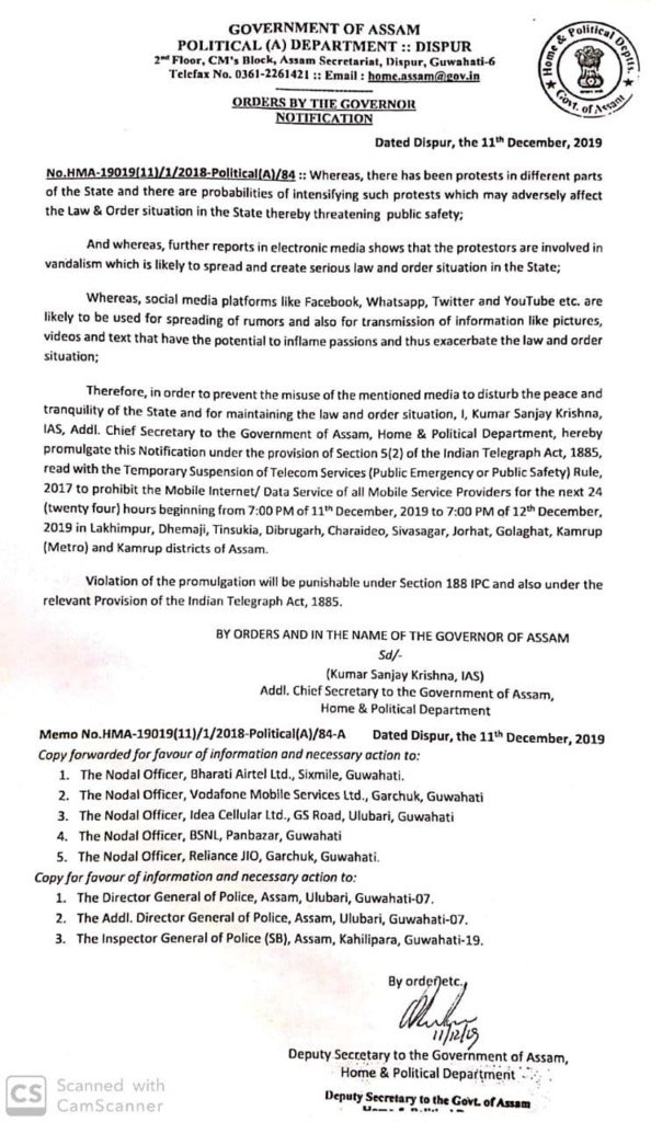 The order issued by the government of Assam says that in order to prevent the misuse of social media platforms such as Whatsapp, Facebook, Twitter in the propagation of rumours and lies, the decision to suspend the Mobile Internet/Data services in select districts for 24 hours has been taken.