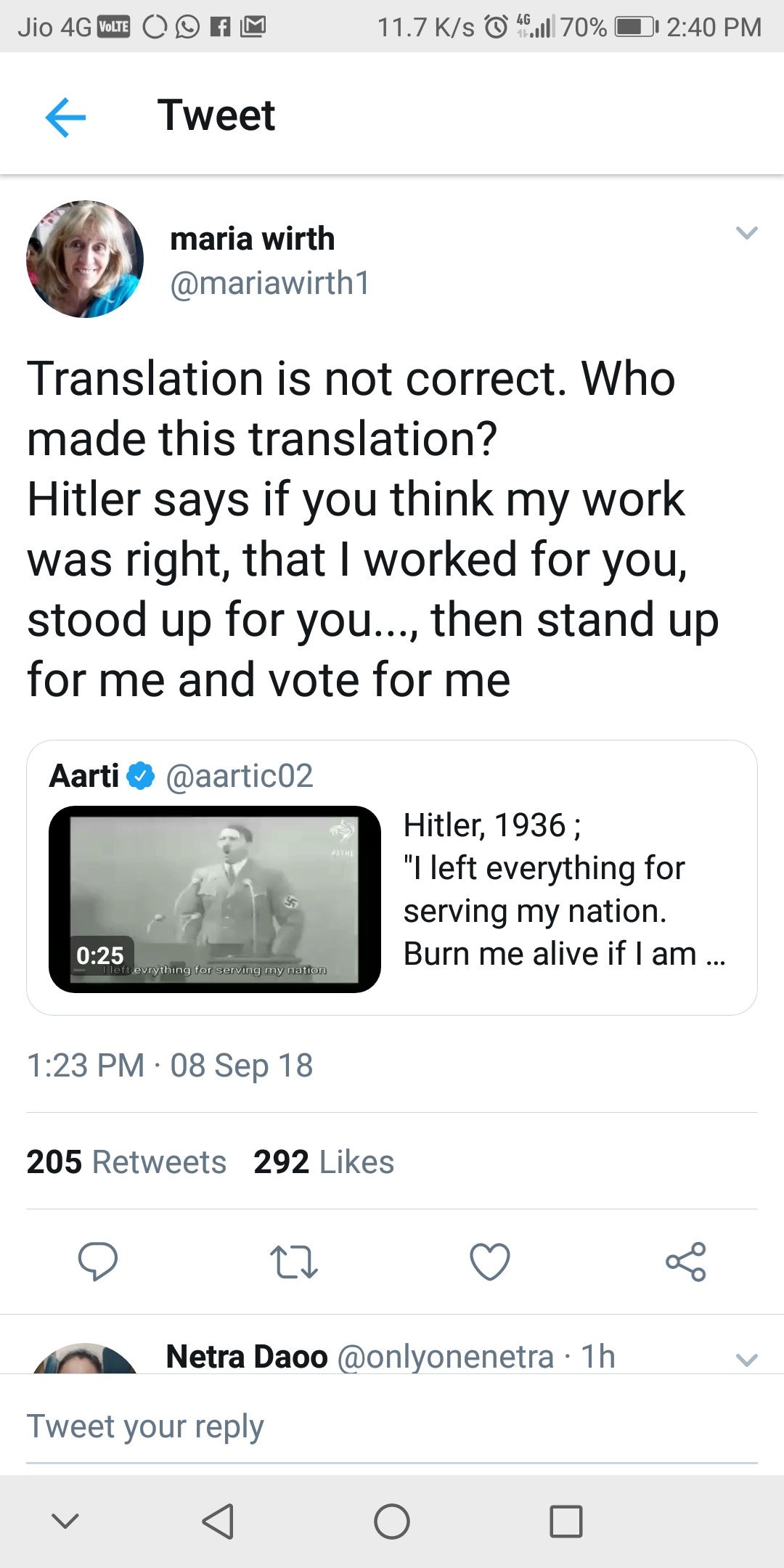 When OpIndia spoke to Maria Wirth, she said that the translation in the video plugged by Anurag Kashyap was completely incorrect. She said that Hitler in the speech said, “…to talk of this people as brothers (volk) to go in the midst of the people of the nation, to overcome all its …. To help and to help again and again”. Since it is a short clip and starts mid-sentence, she theorised that the context in which Hitler was talking about was to say that simply to call fellow Germans as ‘brothers’ is not enough, but the need is to go amidst people and help them over and over again.