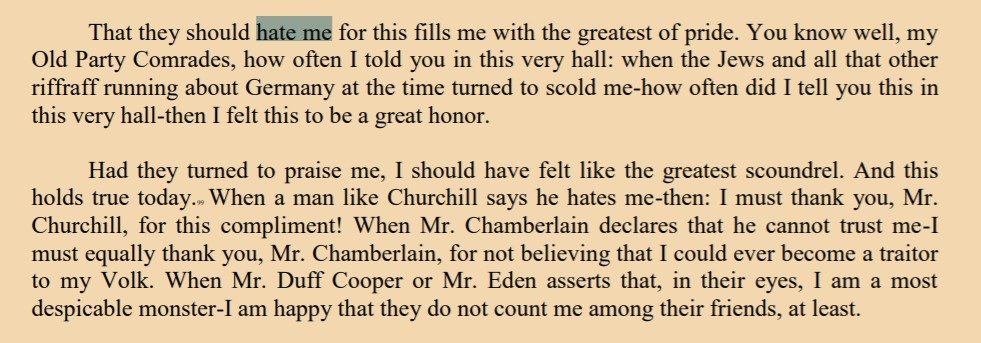One can see from searching the PDF that “hate me” occurs just once while “hate Germany” has no mention at all in any of his speeches from 1922 to 1945.