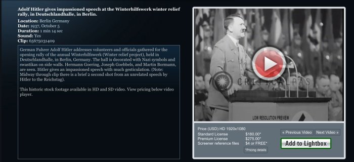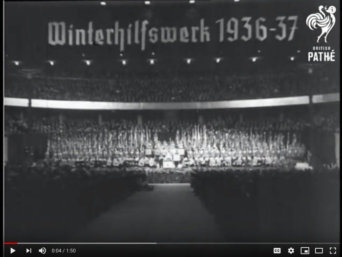 The note related to the video says, “German Fuhrer Adolf Hitler addresses volunteers and officials gathered for the opening rally of the annual Winterhilfswerk (Winter relief project), held in Deutschlandhalle, in Berlin, Germany. The hall is decorated with Nazi symbols and swastikas on sidewalls. Hermann Goering, Joseph Goebbels, and Martin Bormann, are seen. Hitler gives an impassioned speech with much gesticulation. (Note: Midway through clip there is a brief 2 second shot from an unrelated speech by Hitler to the Reichstag)”.