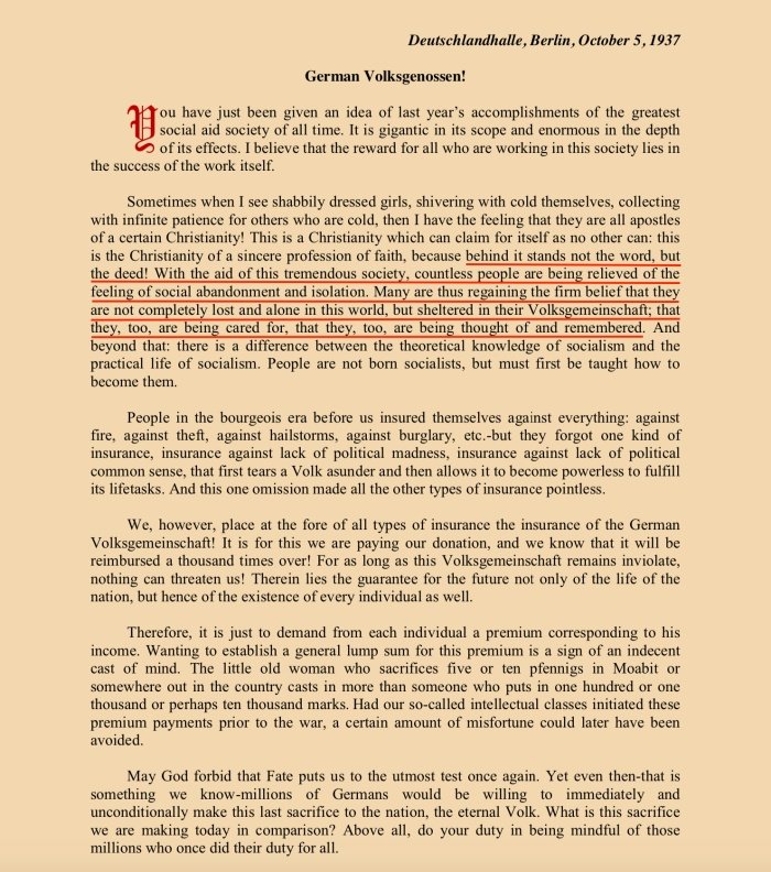 The highlighted portion reads, “…behind it stands not the word, but the deed! With the aid of this tremendous society, countless people are being relieved of the feeling of social abandonment and isolation. Many are thus regaining the firm belief that they are not completely lost and alone in this world, but sheltered in their Volksgemeinschaft; that they, too, are being cared for, that they, too, are being thought of and remembered”.