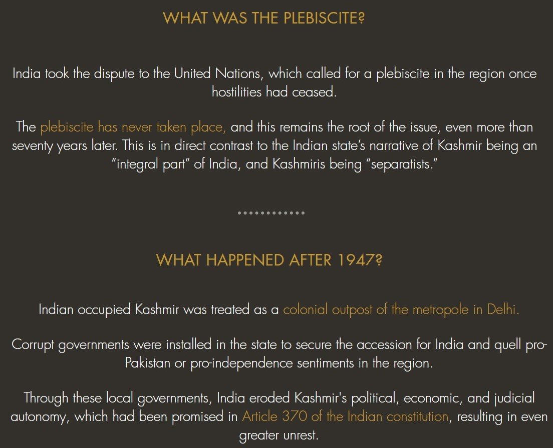 It says, “India took the dispute to the United Nations, which called for a plebiscite in the region once hostilities had ceased. The plebiscite has never taken place, and this remains the root of the issue, even more than seventy years later. This is in direct contrast to the Indian state’s narrative of Kashmir being an “integral part” of India, and Kashmiris being “separatists.” SWK pays no heed to the fact that a plebiscite is impossible now because Pakistan has sold parts of the territory it occupied illegally to China and Kashmiri Jihadists have committed a genocide that has altered the demography of Kashmir irrevocably. But SWK does not mention any of it.