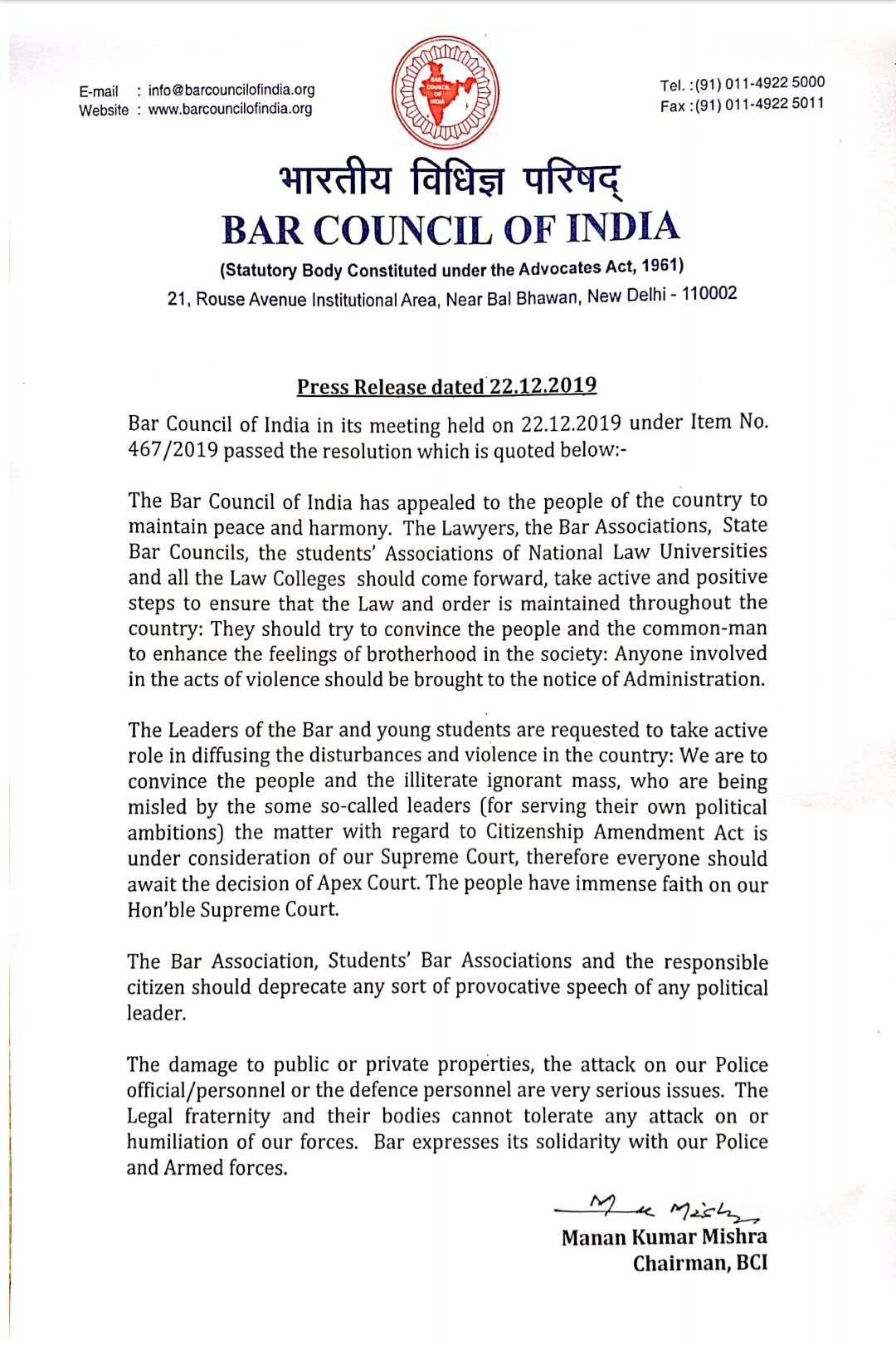 The Bar Council of India has appealed to the people of the country to maintain peace and harmony, in the wake of widespread violence that is happening in several parts of the country in the name of ani-CAA protests. The Bar Council passed a resolution in this regard in a meeting held today, after which they issued a press release.