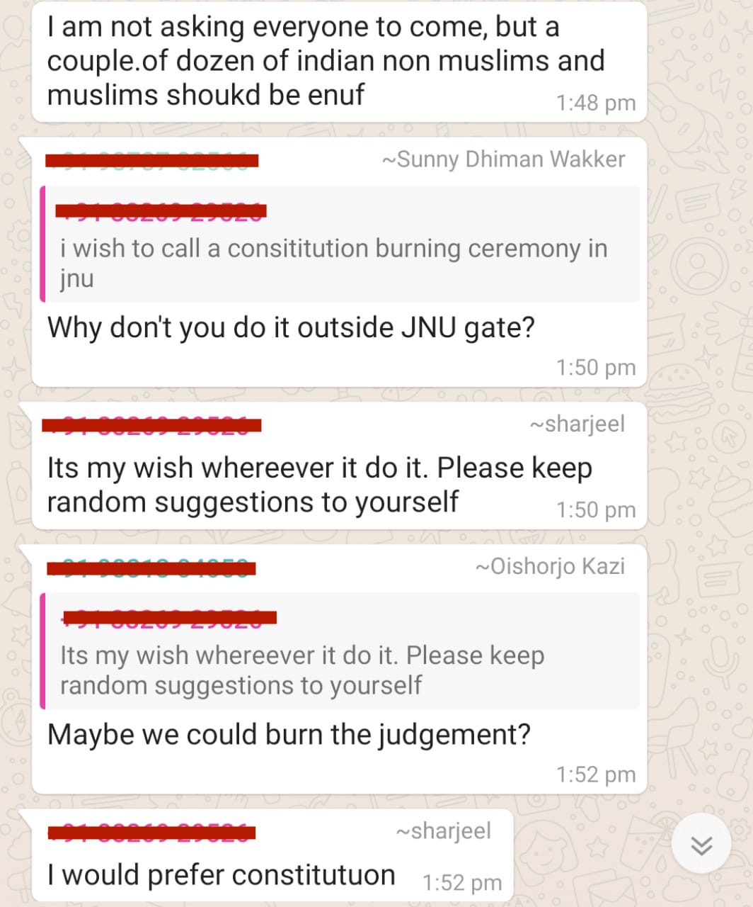 Sharjeel then said how he’d like to have a ‘constitution burning ceremony’ in JNU. He explains how this verdict is a ‘watershed moment’ and that the Muslims who are ‘singing praises of the constitution’ must send a ‘clear message’ that ‘we do not believe in the constitution’. Hence, the same should be burnt, as per Sharjeel.