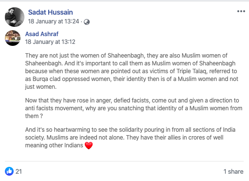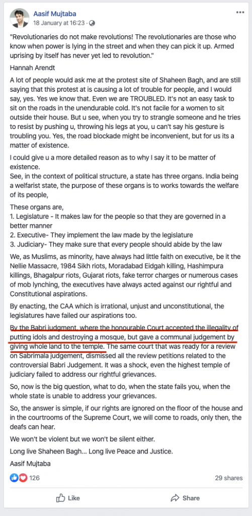 There are more such posts where asserting religious identity of the protestors is more important than the protests. This when the Citizenship Amendment Act, the one which they are protesting against, does not affect the protestors in any way. But the more you read such posts on social media, the more you realise that the anger is more about the Ayodhya verdict than the CAA.