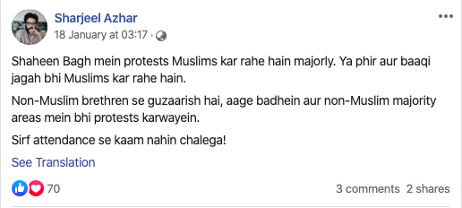 In one of his posts, Sharjeel Azhar has urged non-Muslims to come out and protest in non-Muslim areas as only ‘attendance’ in protests such as Shaheen Bagh isn’t enough. He urges Delhi Chief Minister Arvind Kejriwal to stand in solidarity with the protestors.