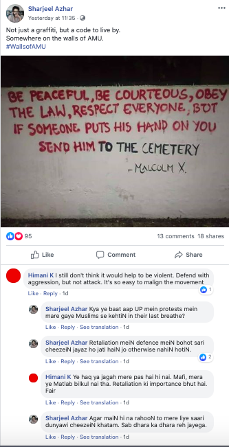Here is a post by one Sharjeel Azhar who believes in sending anyone who ‘puts a hand on you’ to the ‘cemetery’. While it is a quote by American politician Malcolm X, Azhar believes it is not just a graffiti, but a ‘code to live by’.