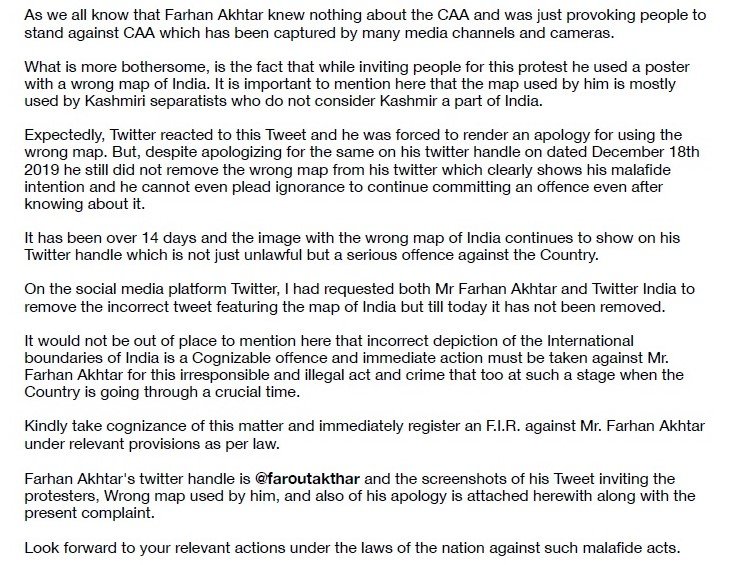 A complaint has been filed against Farhan Akhtar with the Cyber Crime department of the Goa Police for posting a distorted map of India in his tweet that made an appeal to citizens to attend the protests against the Citizenship Amendment Act at the August Kranti Maidan, Mumbai. The distorted map excluded Kashmir from India. The complaint has been filed by Savio Rodrigues, Founder and Editor-in-Chief of Goa Chronicles.