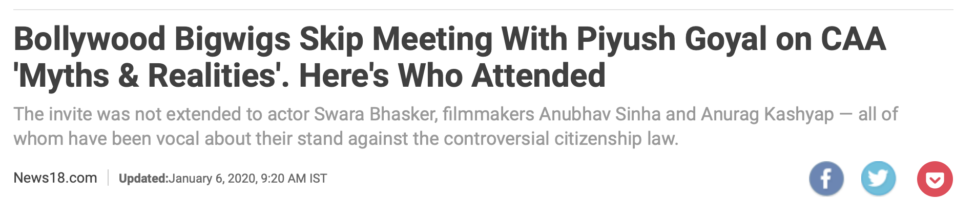 Essentially, what the media wished to do was to say that all the “big celebrities” from B-Town oppose the Citizenship Amendment Act and the ones who bothered to attend the meeting with Minister Piyush Goyal were merely “small-time players”.