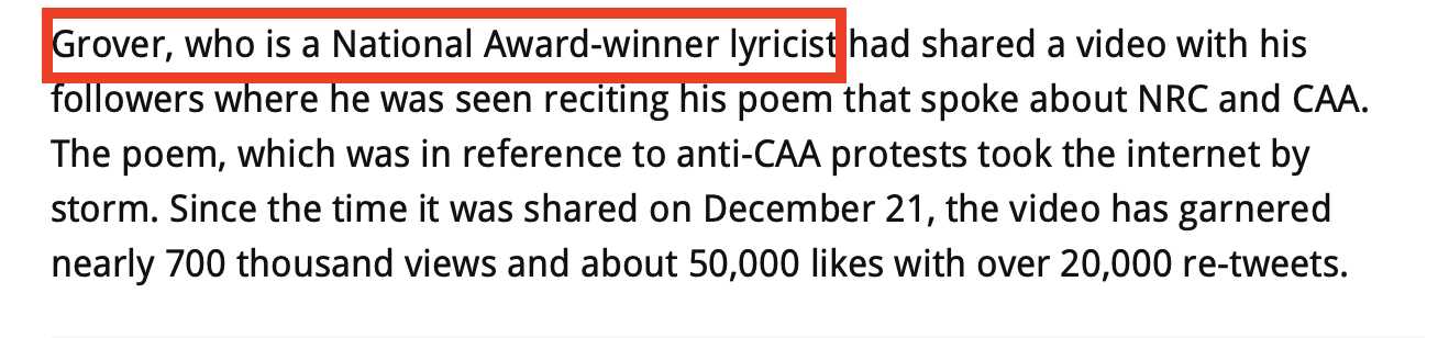 Mid-Day chose to describe Varun Grover as a “National Award winning lyricist”. Perhaps mid-day had selective amnesia and forgot to add “MeToo accused” like they did for Anu Malik and Kailash Kher.