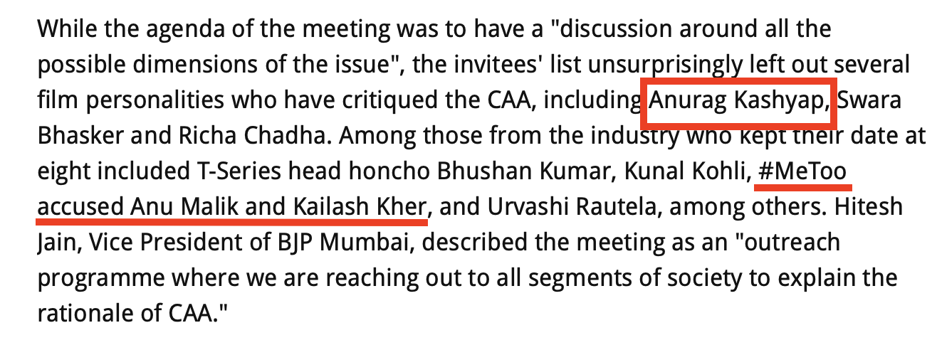 This theory is further substantiated with the fact that the same mid-day that describes Anu Malik and Kailash Kher as ‘Metoo accused’ after they attended a meeting with Piyush Goyal, failed to mention the same ‘credentials’ of another entertainer who is against the Citizenship Amenment Act and the Modi government.