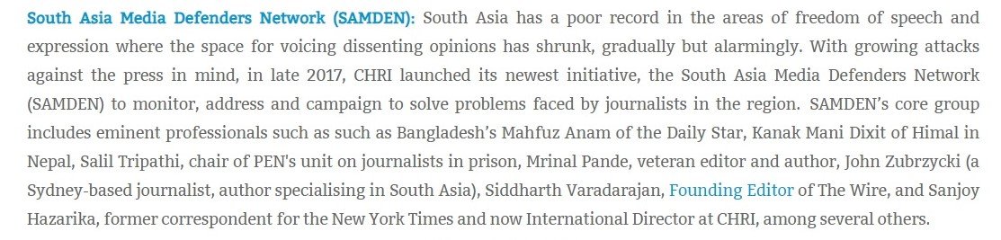 The SAMDEN is particularly interesting. CHRI’s website states, “SAMDEN’s core group includes eminent professionals such as such as Bangladesh’s Mahfuz Anam of the Daily Star, Kanak Mani Dixit of Himal in Nepal, Salil Tripathi, chair of PEN’s unit on journalists in prison, Mrinal Pande, veteran editor and author, John Zubrzycki (a Sydney-based journalist, author specialising in South Asia), Siddharth Varadarajan, Founding Editor of The Wire, and Sanjoy Hazarika, former correspondent for the New York Times and now International Director at CHRI, among several others.”