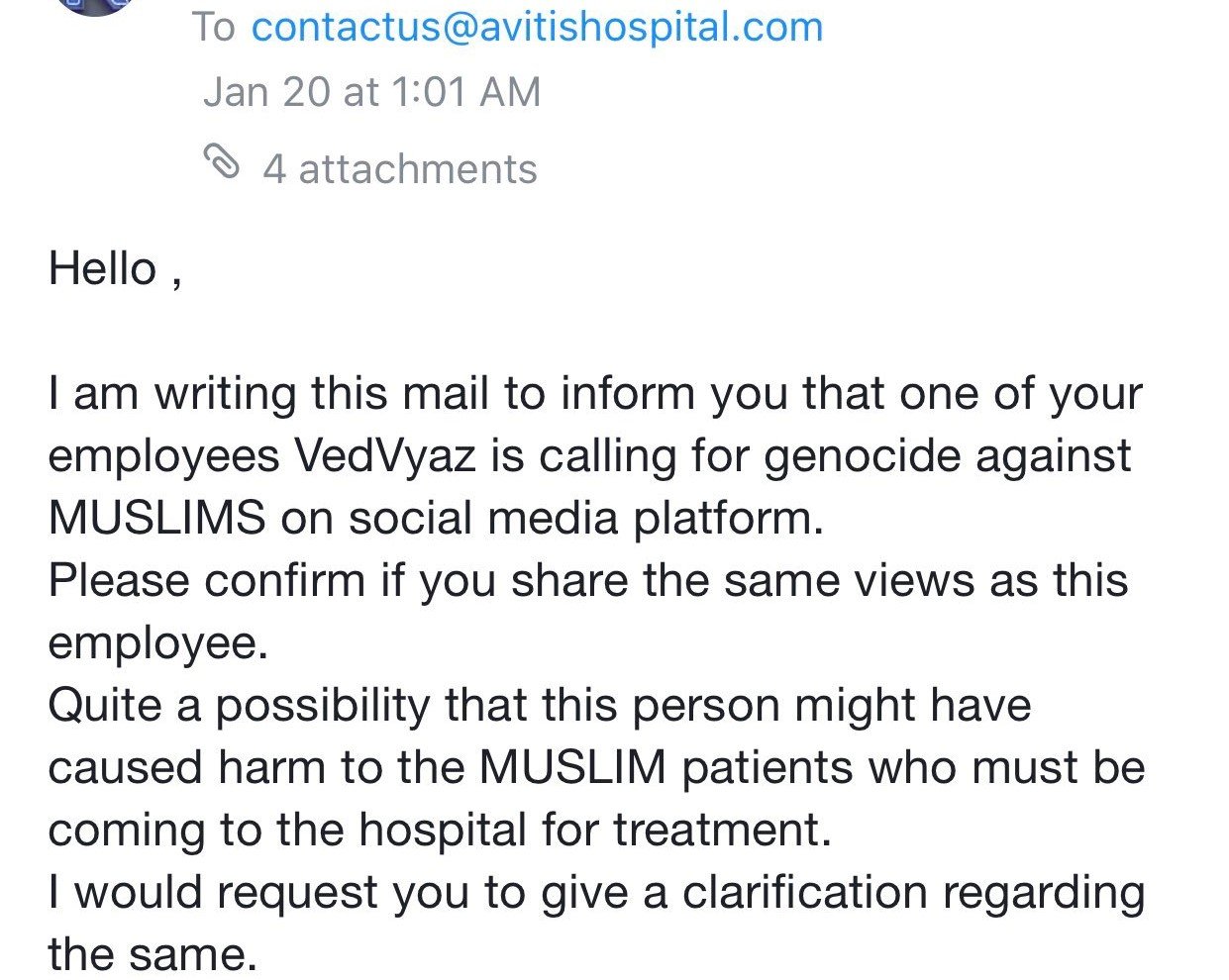 Soon, people started registering their complaints with the hospital. It was claimed that Dr Vishwanathan was calling for genocide against Muslims on social media. “Please confirm if you share the same views as this employee,” the hospital was told. It was also suggested that the doctor might have caused harm to Muslim patients under his care.