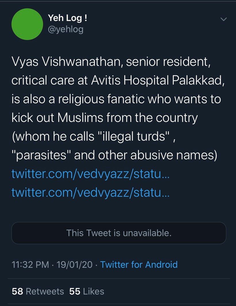 It all began on the 19th of January when a Twitter handle @yehlog published personal details of Dr Vishwanathan online with the primary intention of damaging his reputation and his career prospects. She accused him of being a ‘religious fanatic’ who wants to ‘kick out Muslims’ from the country.