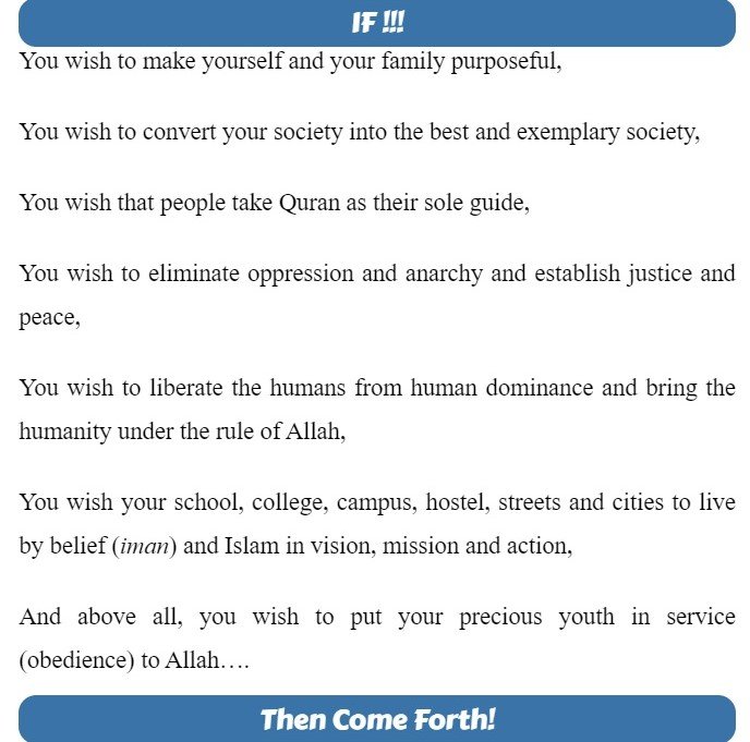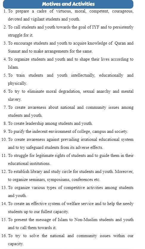 According to the IYF, the Muslim youth should come forward “To attain the happiness of Allah and achieve Jannat (Heaven) join the effort and struggle of dominating of the motto ‘La ilaaha illallaah’ (There is no God and sovereign except Allah) and making Quran the constitution of lives of humans. Become an integral part of this important student and youth organization Islamic Youth Federation (IYF). And sacrifice the most important and precious phase of your life, your youth, in the path of your creator and lord, Allah.”