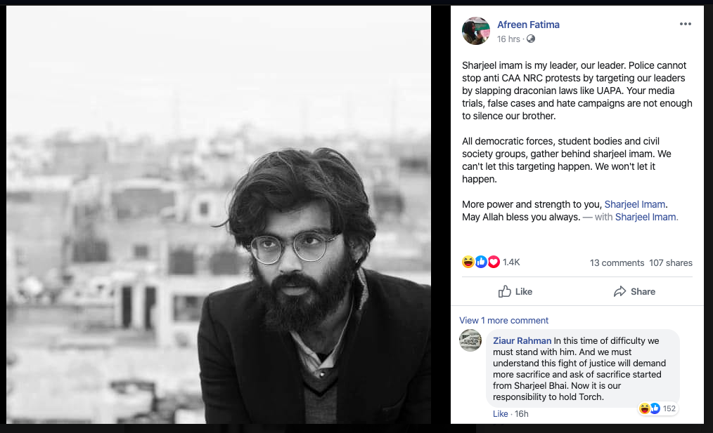Afreen Fatima, JNU student and JNUSU Councillor, too, took to Facebook to stand by Imam. Referring to him as her ‘leader’, Fatima said that media trials, false cases and hate campaigns will not silence ‘our brother’.