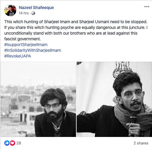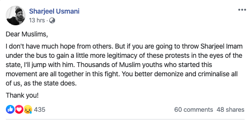 Sharjeel Usmani further took to Facebook to say that he stands by Sharjeel Imam. “If you throw Sharjeel Imam under the bus to gain a little more legitimacy of these protests in the eyes of the state, I’ll jump with him,” he said.