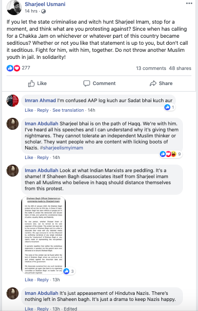 He is also supported by one Iman Abdullah endorses Imam’s views as he is on the path of ‘Haqq’. Referring to Imam as ‘independent Muslim thinker’ he calls those who do not support him as ‘Hindutva Nazis’.