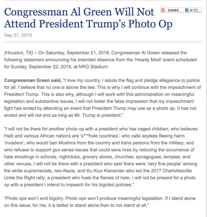 An Seventh Democratic Party representative, Al Green pulled out from attending the Howdy Modi event not because of his imaginary opposition to Prime Minister Modi but because of his domestic political reasons. That fact is evidenced by the statement published on his official website.