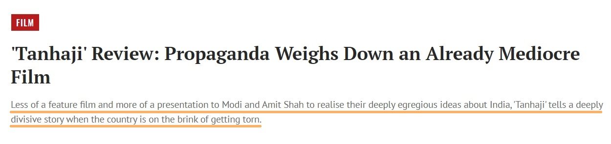Tanul Thakur, who reviewed the movie for the Wire seems to have kept his masters happy as he described the movie as ‘less of a feature film and more of a presentation to Modi and Amit Shah’ to realise their deeply egregious ideas about India. ‘Tanhaji’ tells a deeply divisive story when the country is on the brink of getting torn, he wrote.