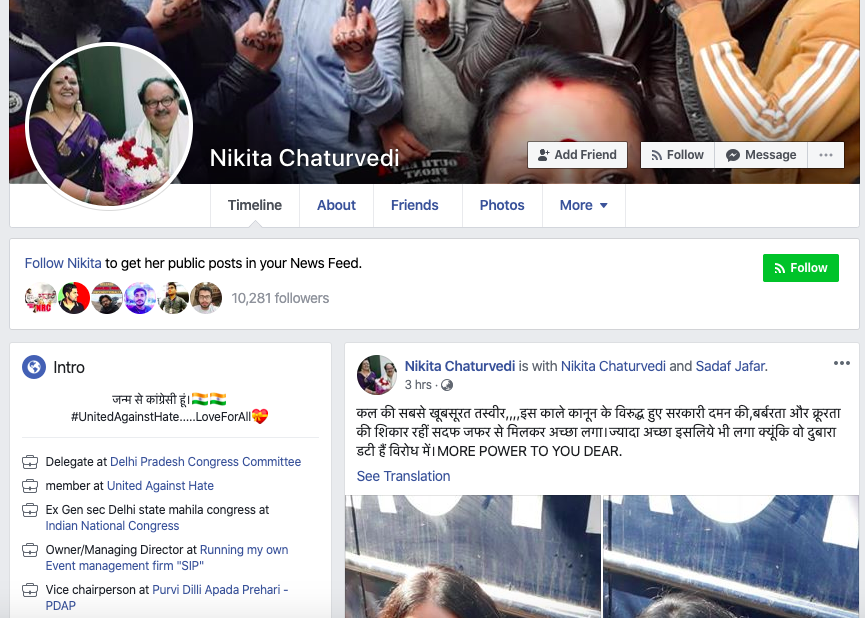 In above message, she could be seen sharing a video of Umar Khalid’s speech during anti-CAA protests. As can be seen, she is participant of a group called ‘United Against Hate’. Her Facebook profile says she is a ‘delegate at Delhi Pradesh Congress Committee’ and has been general secretary at Delhi State Mahila Congress.