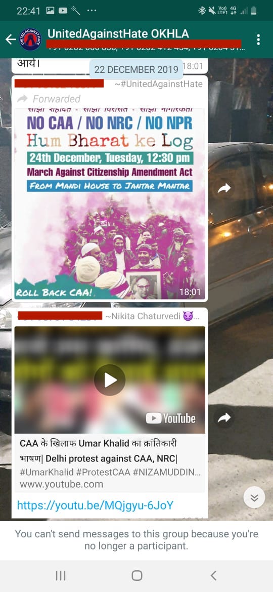 In the above message, Chaturvedi, whose phone ends with number 4231 can be seen asking when Umar Khalid and others would reach the venue for anti-CAA protests.