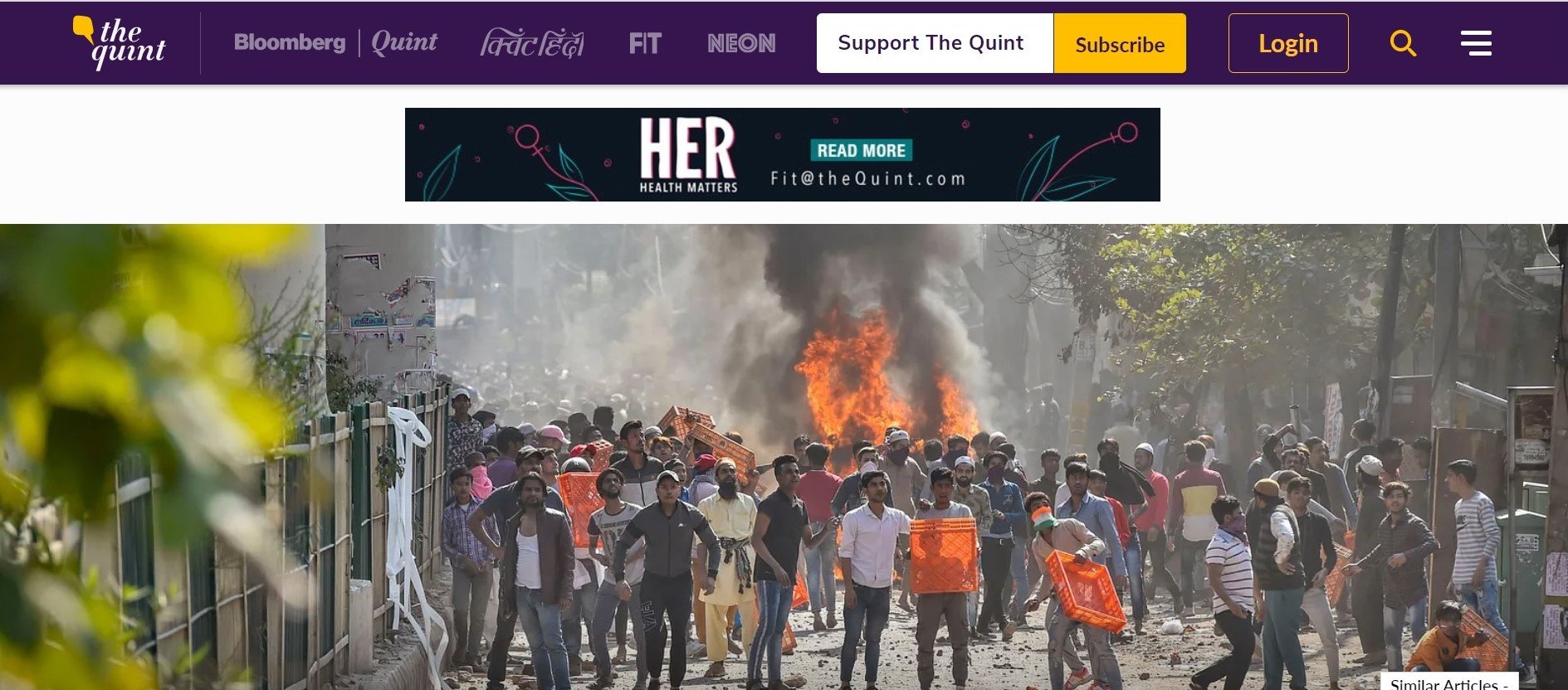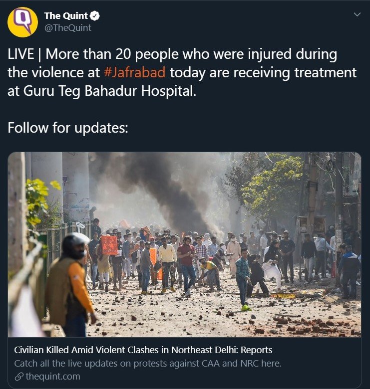 Amidst all of this, the behaviour of one particular ‘media outlet’ has been very questionable. The featured image of a report shared by the Leftist anti-BJP propaganda outlet The Quint shows the same man in the presence of people wearing skull-caps with evidence of arson in the background. The colour pattern of the clothing matches perfectly with the same as the gun-wielding man.