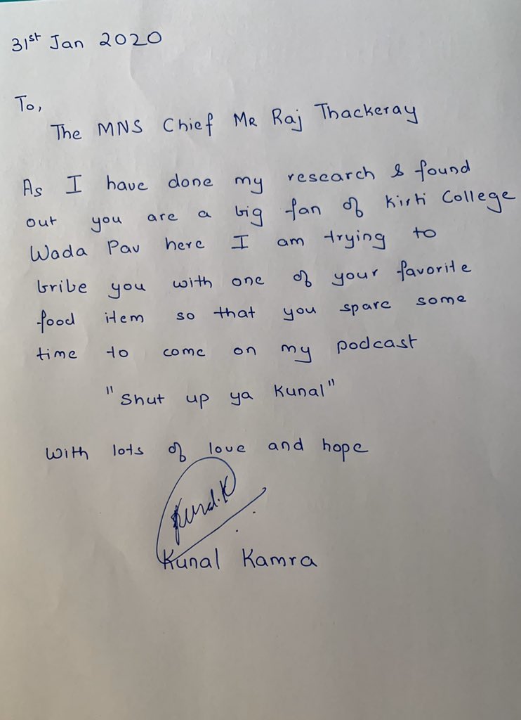 In a ‘letter’ to the MNS supremo that Kunal Kamra shared on social media, he said, “As I have done my research and found out you are a big fan of Kirti College wada pav, here I am trying to bribe you with one of your favourite food items so that you could come on my podcast.”