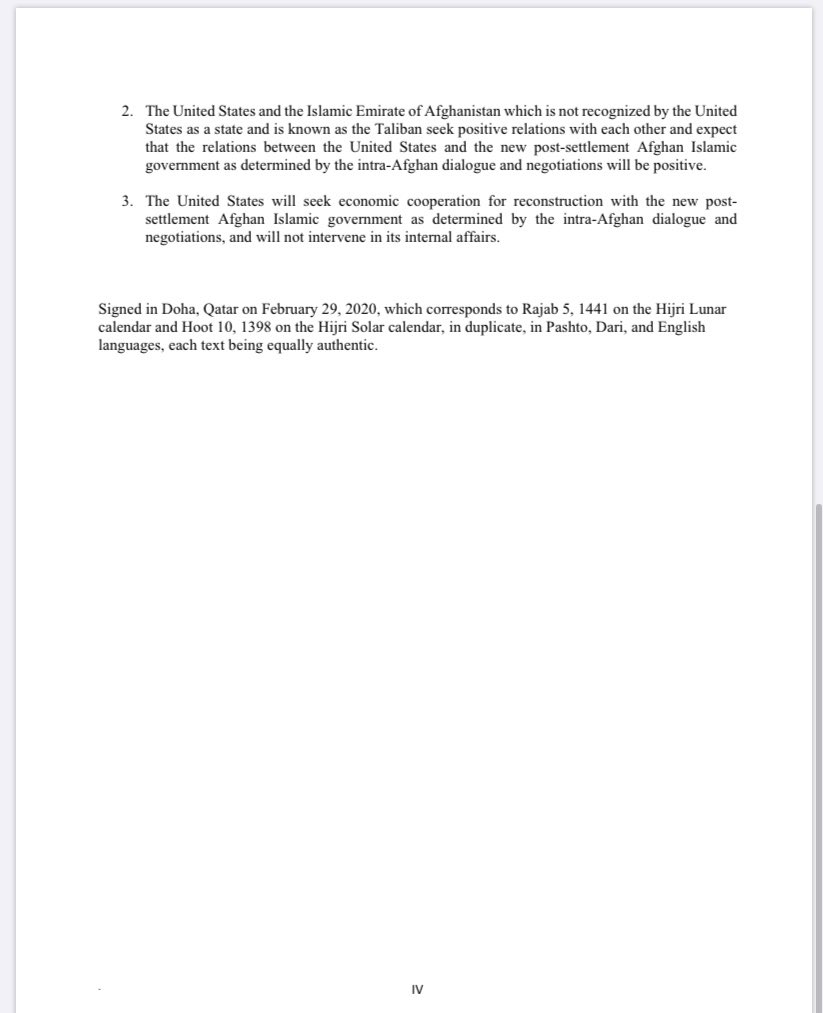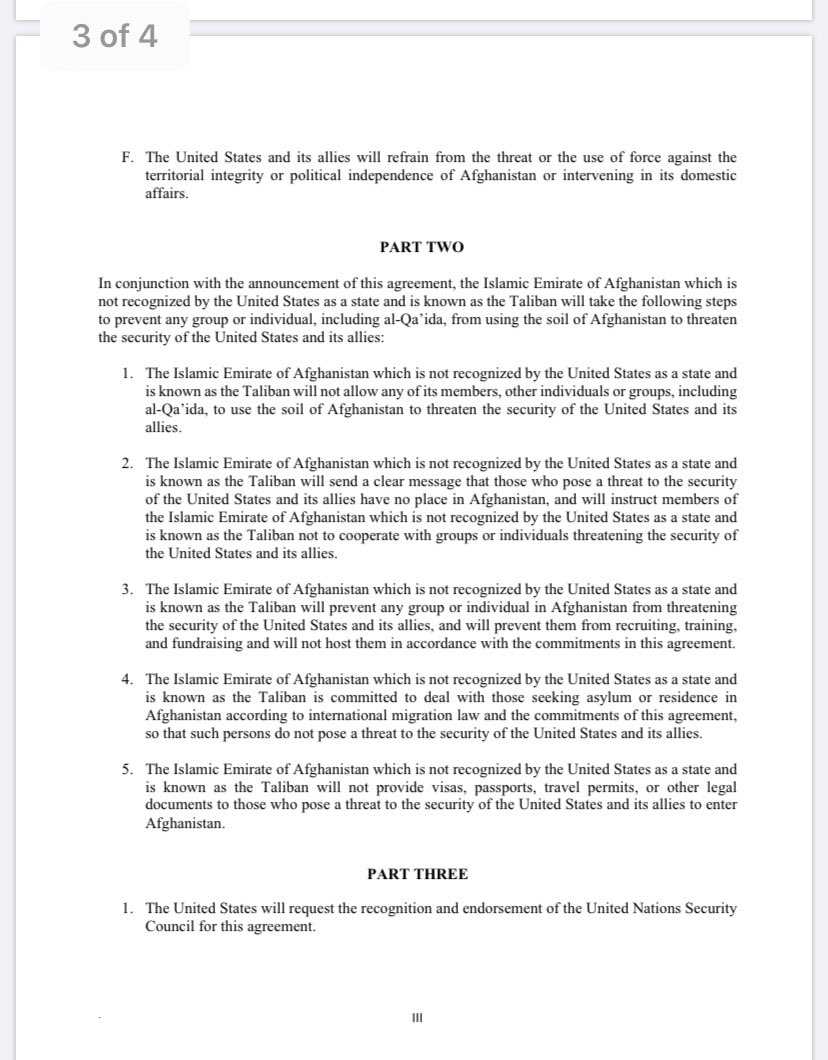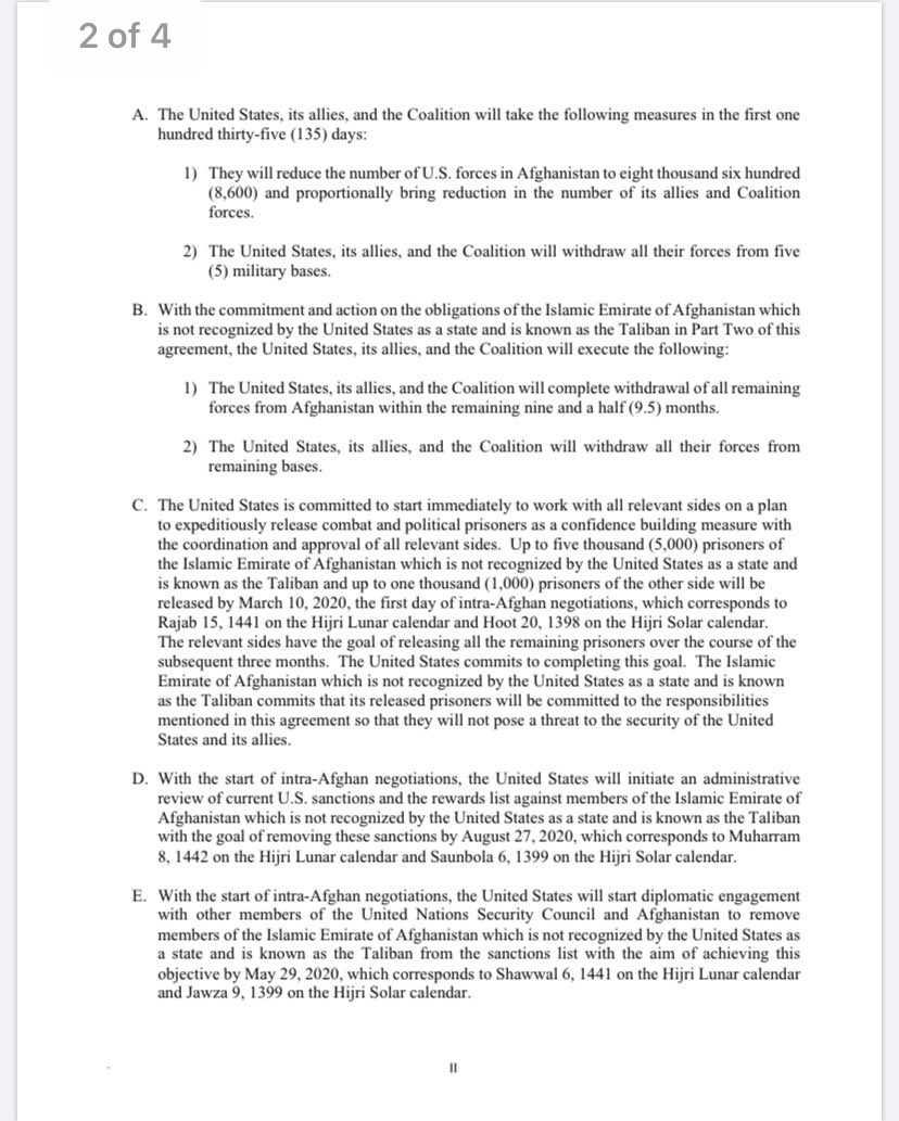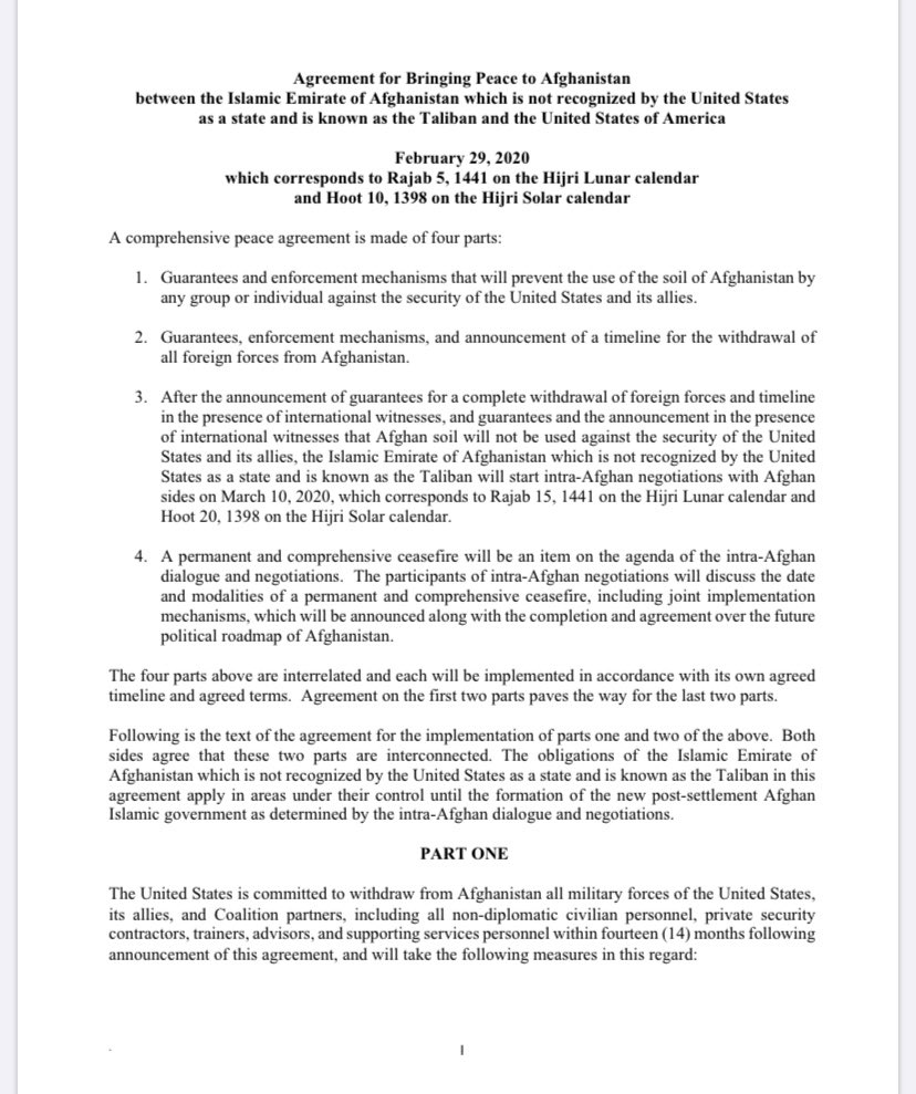 Here’s the 4 page text of the US/Taliban deal signed in Doha. Trump has described it as “a powerful path forward to end the war in Afghanistan and bring our troops home.” pic.twitter.com/gmFetTYIZb