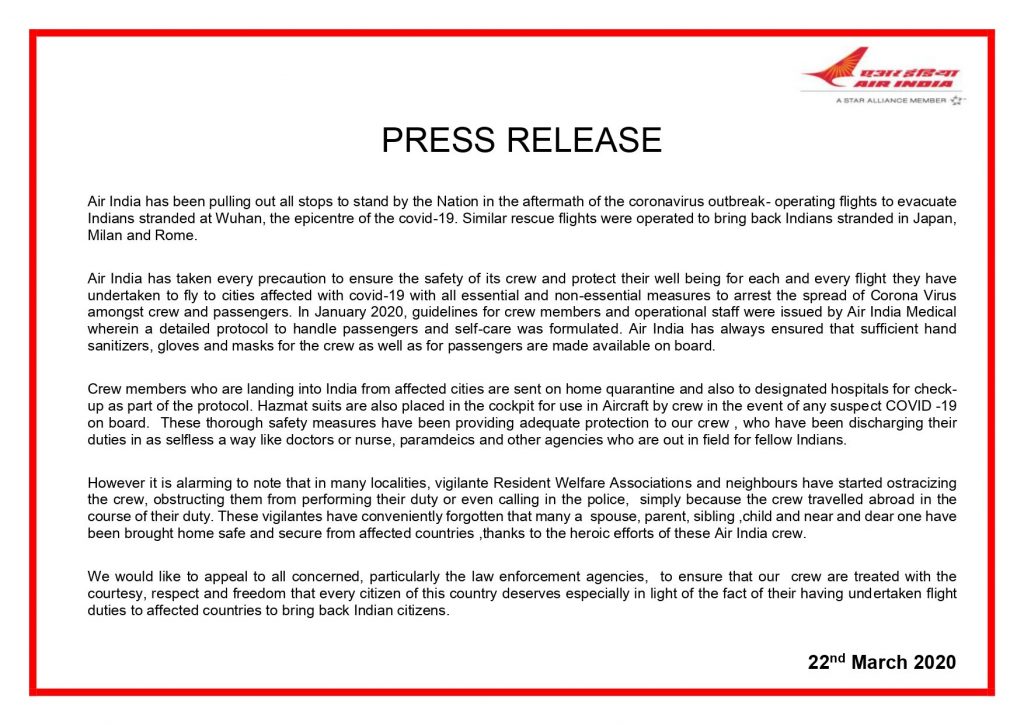 Air India said in its press release, “It is alarming to note that in many localities, vigilante Resident Welfare Associations and neighbours have started ostracizing the crew, obstructing them from performing their duty or even calling in the police, simply because the crew travelled abroad in the course of their duty. These vigilantes have conveniently forgotten that many a spouse, parent, sibling, child and near and dear one have been brought home safe and secure from affected countries, thanks to the heroic efforts of these Air India crew.”
