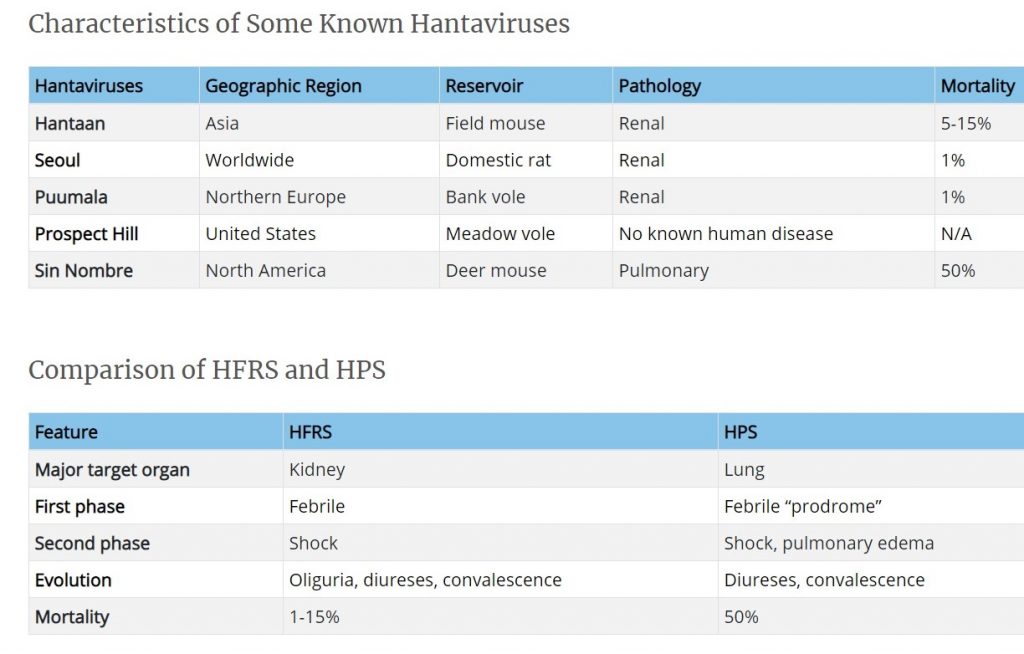 The Hantavirus is named for the Hantan River in South Korea, where an early outbreak was observed. Hantaviruses are a family of viruses spread mainly by rodents and can cause varied disease syndromes in people worldwide. There are two syndromes that the virus can cause in humans. One is the hantavirus pulmonary syndrome (HPS) and the other is the hemorrhagic fever with renal syndrome (HFRS). The former is typical in the Americas and is said to be caused by “New World” hantaviruses and the latter is typical of Europe and Asia and is said to be caused by “Old World” hantaviruses.