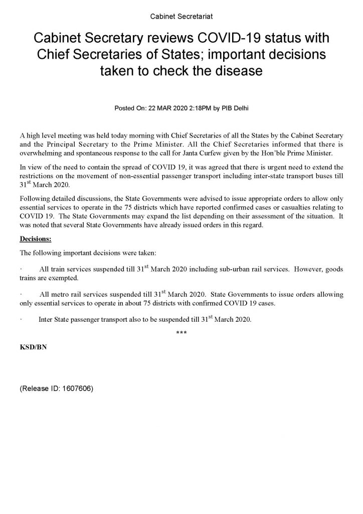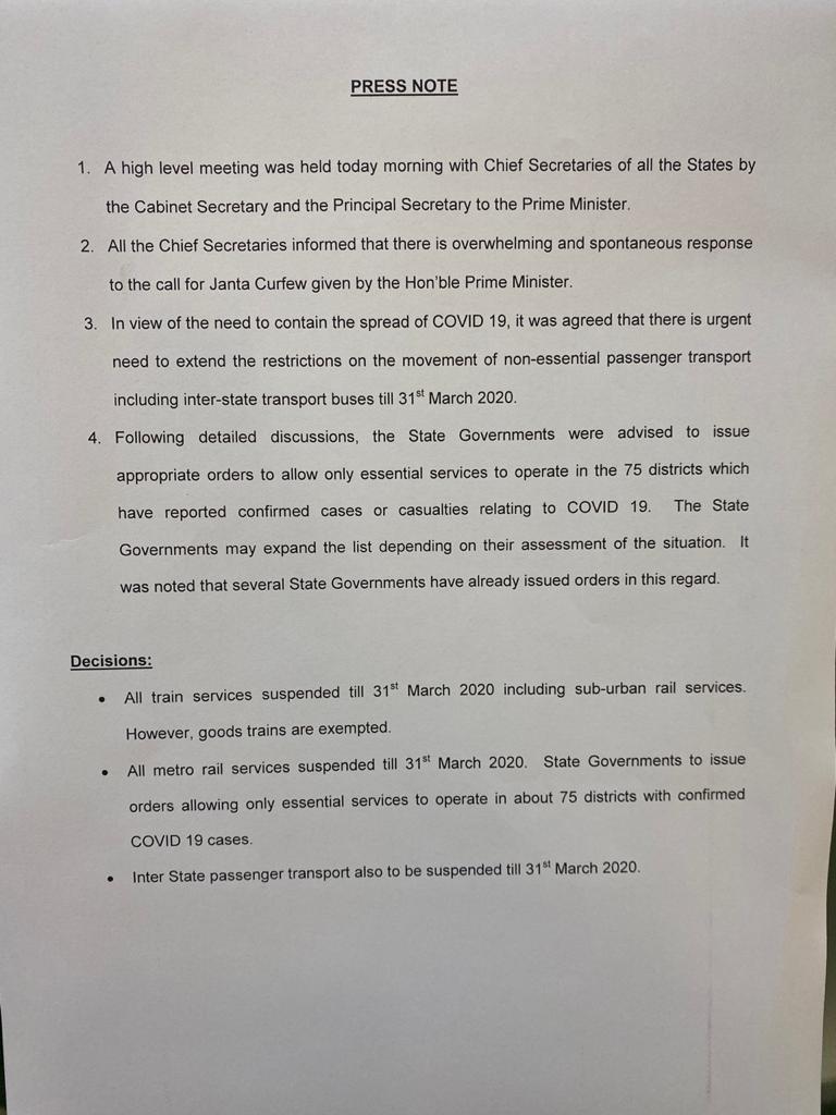 The notification also says that in view of the need to contain the spread of COVID 19, it was agreed that there is urgent need to extend the restrictions on the movement of non-essential passenger transport including inter-state transport buses till 31st March 2020. Therefore, all train services with the exception of goods trains have been suspended until the 31st of March. All metro services have also been suspended till 31st March. In addition to that, inter-state passenger transport has also been suspended until the 31st of March. Only essential services will operate in the districts under lockdown.